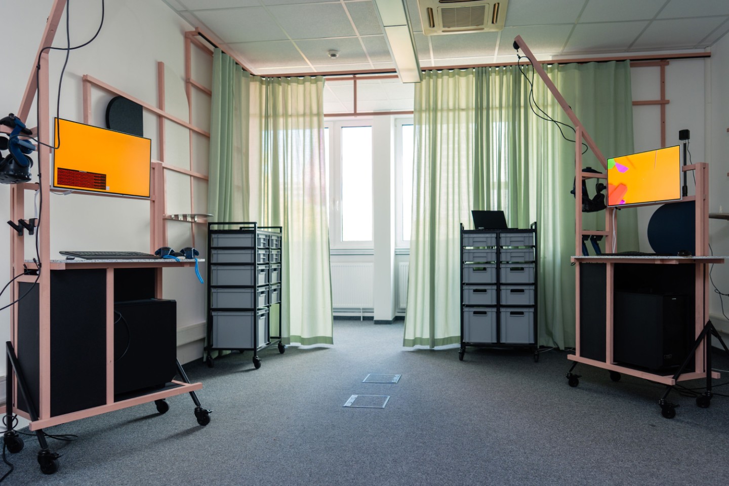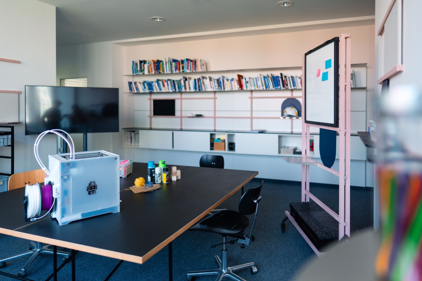 Mit unserem Transformation Lab haben wir eine Infrastruktur geschaffen, die unsere kollaborative und kundenorientierte Arbeitsweise optimal unterstützt. Die modulare Architektur ermöglicht es, dynamisch auf Anforderungen im Entwicklungsprozess zu reagieren: Eine Strategie-Session am Whiteboard lässt sich nahtlos in gemeinsames Prototyping überführen; aus einem analogen Meeting wird bei Bedarf ein hybrides Brainstorming unter Einsatz von Virtual oder Augmented Reality. Das Mobiliar wurde gemeinsam mit dem Berliner Designbüro Studio milz entworfen.