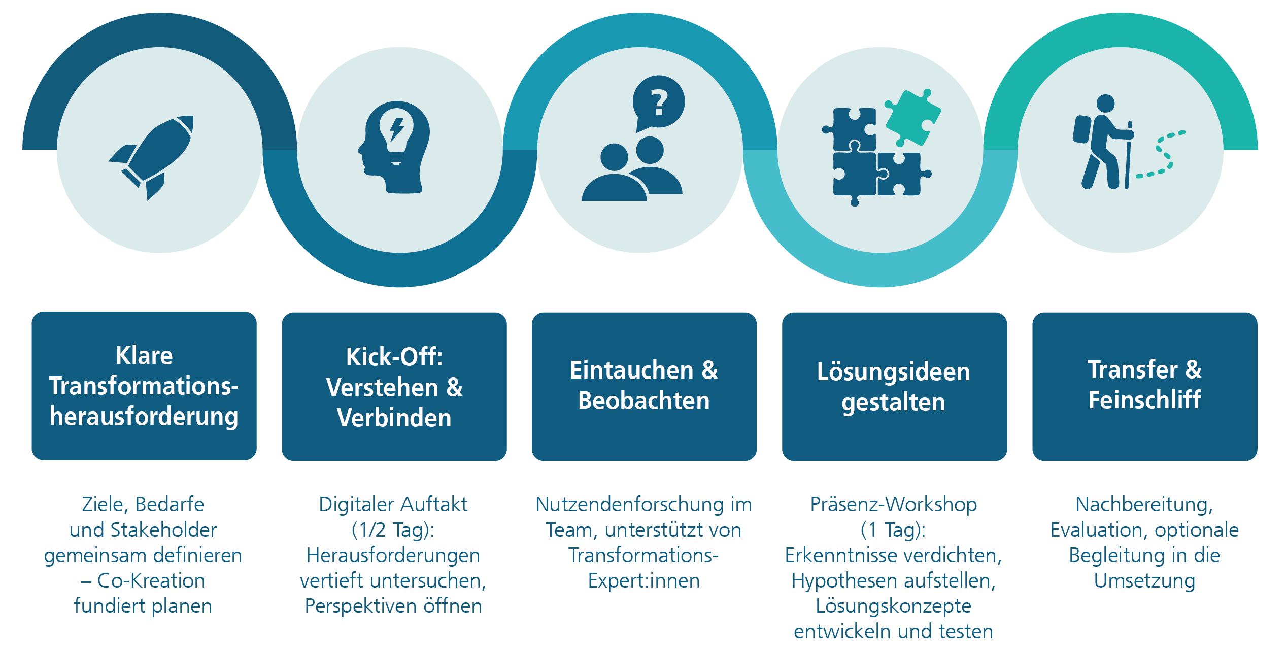 - Reale Wirkung: In kurzer Zeit von der Idee bis zur validierbaren, konkreten Lösung – optional mit Weiterbegleitung bis zur Implementierung durch unsere Expert:innen.